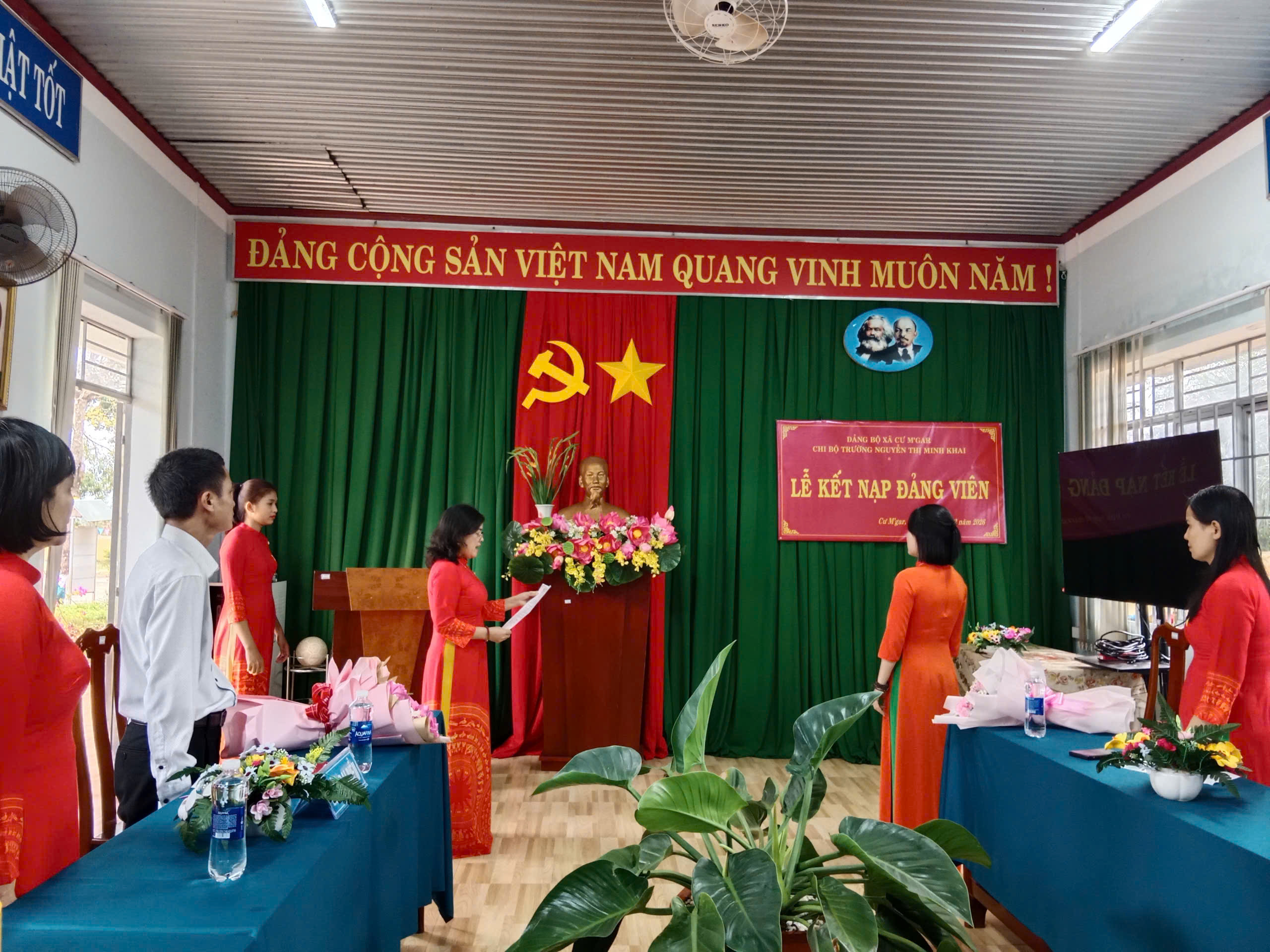 Phát biểu và tặng hoa tại buổi lễ, đồng chí Trần Ngọc Giang chúc mừng Chi bộ nhà trường đã kết nạp thêm một đảng viên mới, đồng thời ghi nhận những nỗ lực phấn đấu của đồng chí Lê Thị Hải Lý. Đồng chí mong muốn đảng viên mới tiếp tục rèn luyện bản lĩnh chính trị, giữ gìn phẩm chất đạo đức, phát huy tinh thần trách nhiệm trong công việc, xứng đáng là người đảng viên trong môi trường giáo dục – nơi ươm mầm tri thức và nhân cách cho thế hệ tương lai.