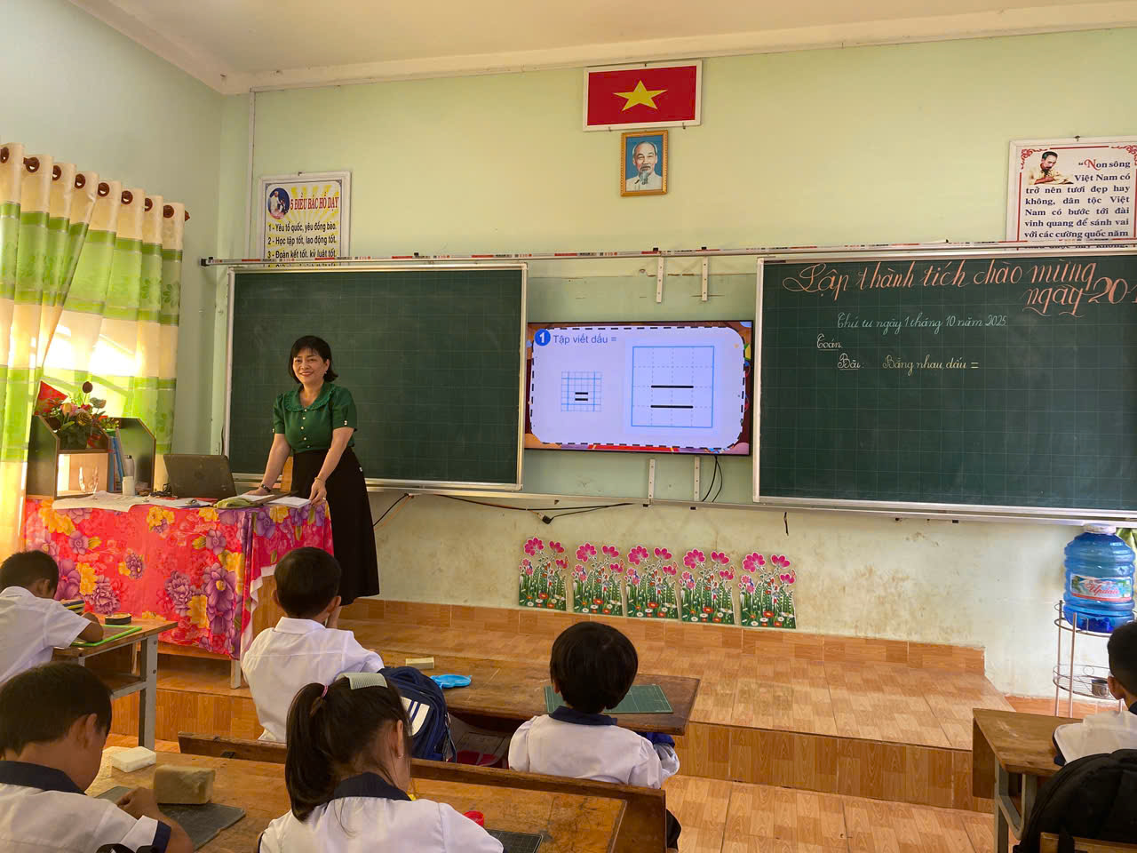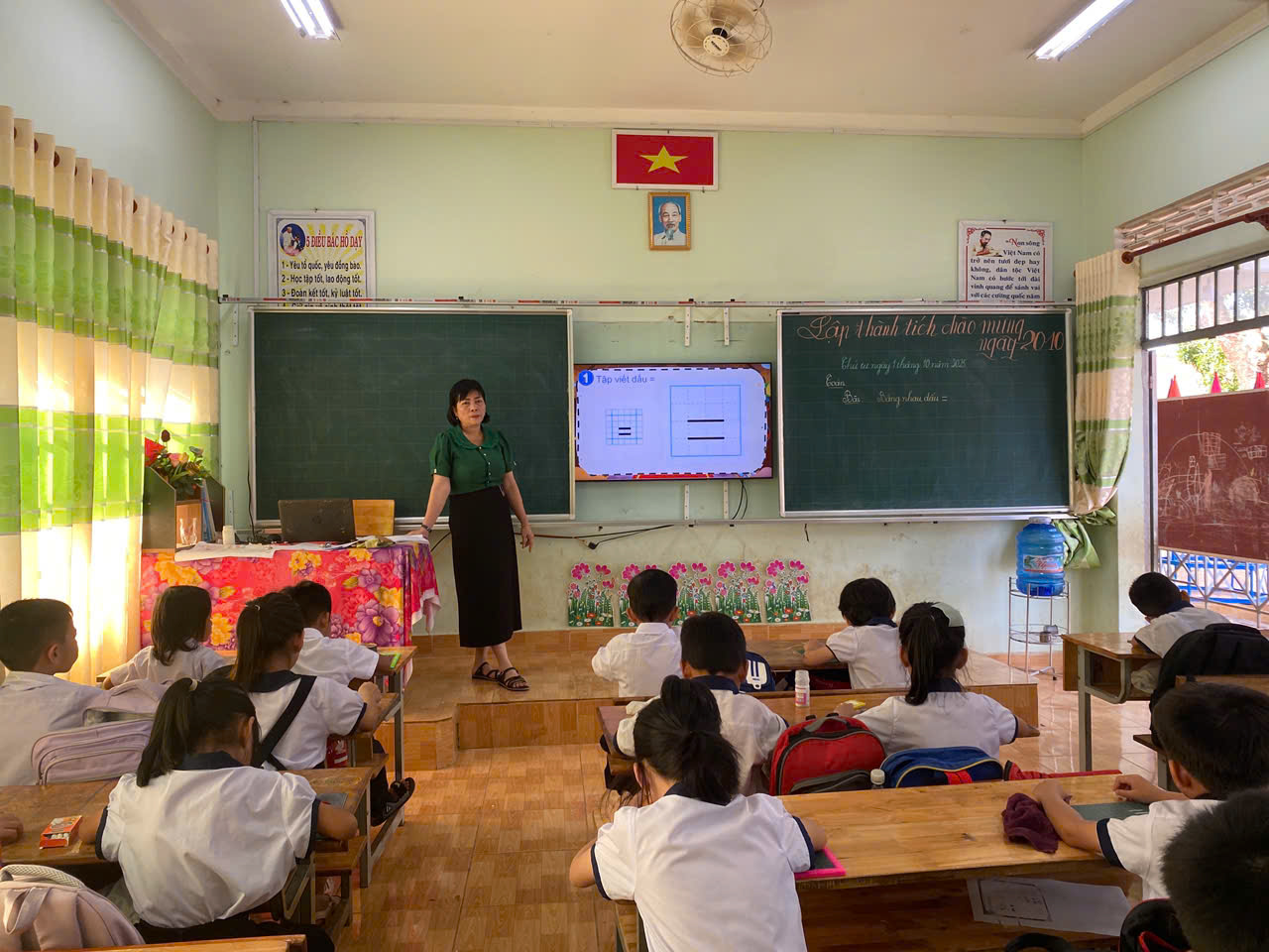 Với cách dạy linh hoạt và sáng tạo, cô giáo Nguyễn Thị Hóa đã biến bài học tưởng chừng đơn giản thành một hành trình khám phá thú vị. Học sinh được quan sát, thao tác trực quan với que tính, hình ảnh minh họa, đồ dùng học tập nhiều màu sắc. Từng cặp mắt tròn xoe dõi theo bàn tay cô khi cô đặt các que tính lên bàn: “Hai bên có số lượng bằng nhau, ta viết dấu bằng giữa hai vế nhé!”. Chỉ trong khoảnh khắc ấy, khái niệm “=“ – dấu hiệu của sự cân đối – đã trở nên gần gũi, dễ hiểu và thật tự nhiên với các em học sinh lớp 1.